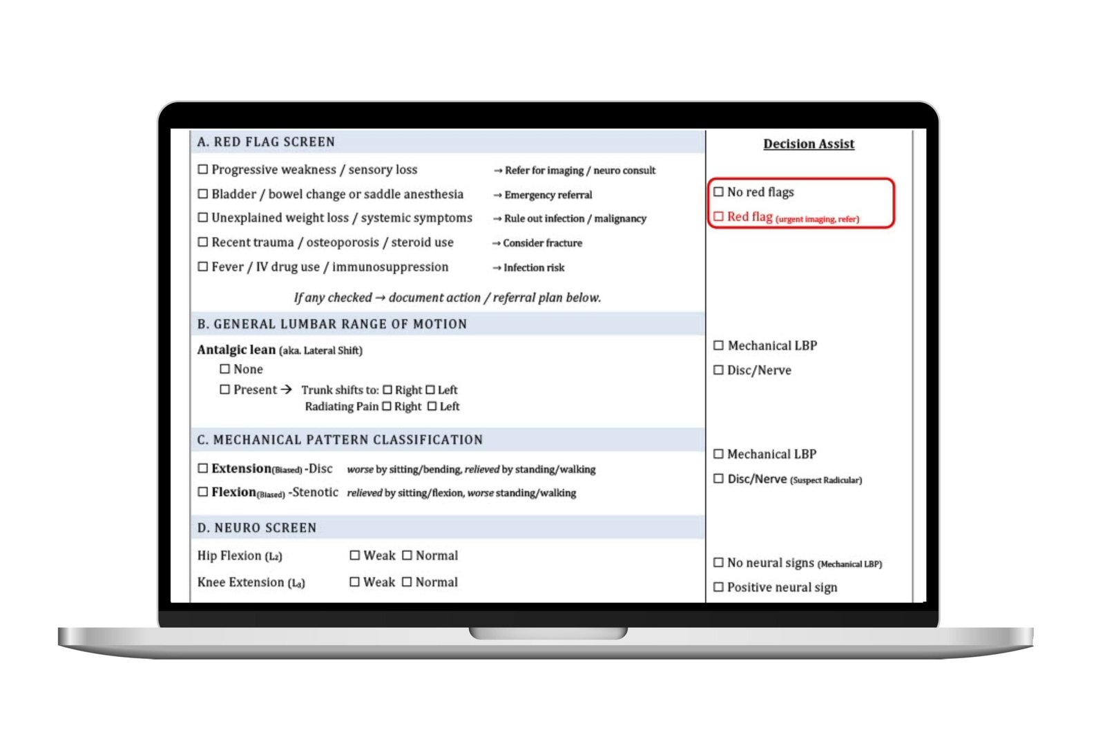 A clinically structured, evidence-informed checklist that helps primary-care physicians quickly rule out red flags, identify mechanical patterns, and reassure patients with confidence — without ordering unnecessary imaging.